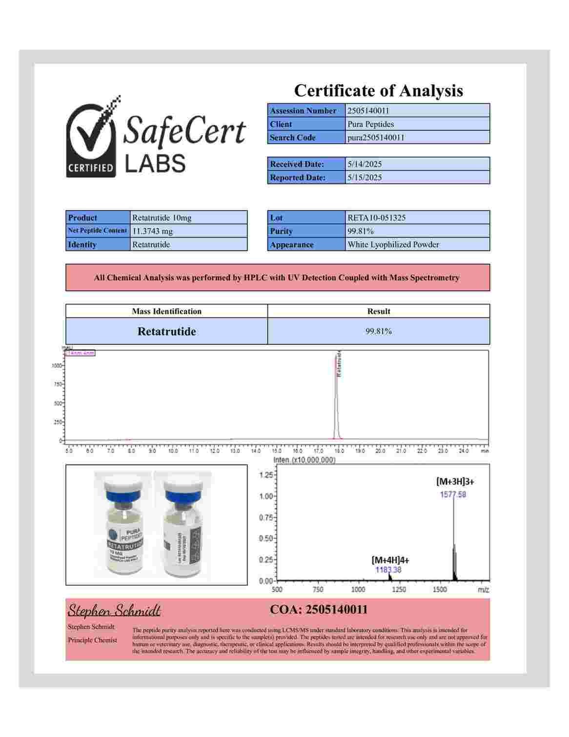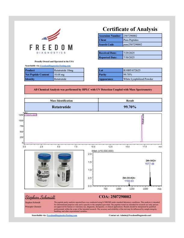 Are you looking to buy RETA-10 for your next laboratory research project? At Pura Peptides, we provide top-tier RETA-10 for sale, specifically designed for analytical and experimental research. Our RETA-10 is currently instock and ready for immediate worldwide shipping. When you choose to order RETA-10 online from us, you are guaranteed a product that meets rigorous purity standards.