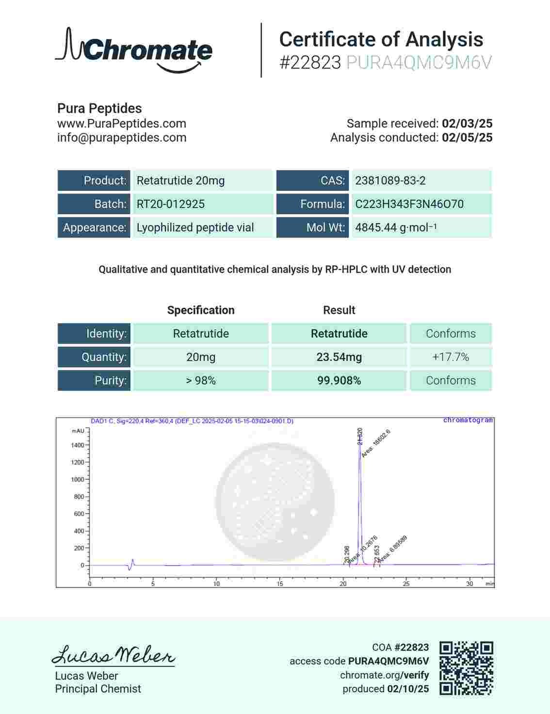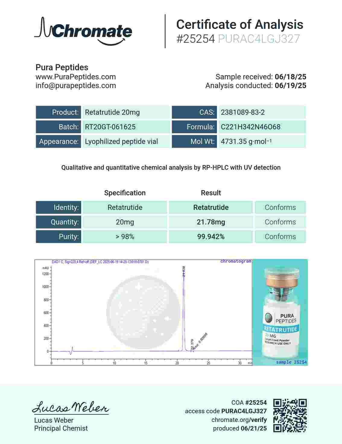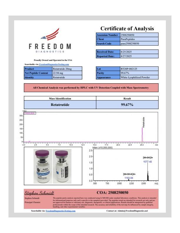 Are you looking to buy RETA-20 for your next laboratory research project? At Pura Peptides, we provide top-tier RETA-20 for sale, specifically designed for analytical and experimental research. Our RETA-20 is currently instock and ready for immediate worldwide shipping. When you choose to order RETA-20 online from us, you are guaranteed a product that meets rigorous purity standards.